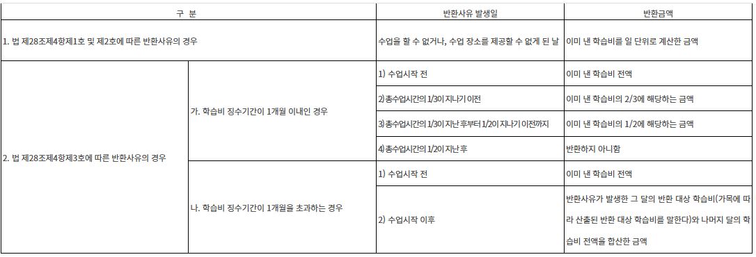 ㅁ 첨부파일의 수강료 환불신청서를 작성하셔서 제출하여 주시기 바랍니다. - 문의 : 02)766-3262 - Email : ktaia123@naver.com -------------------------------------------------- 평생교육원 환불규정고시 <개정 2019. 7. 2.> 학습비 반환기준(제23조 관련) 비학점 교과목(평생교육법 시행령) 교육훈련기관의 장은 다음 각 호의 어느 하나에 해당하는 경우에는 반환 기준에 따라 이미 납부한 학습비 반환 1. 과오납의 경우 2. 학습자 "방역법"에 따른 방역 의무를 이행하기 위하여 군에 입대하는 경우 등 법령에 의하여 학습을 계속할 수 없는 경우 3. 학습자가 학습 포기의 의사를 표시한 경우 4. 학습자가 본인의 질병.사망 또는 천재지변이나 그 밖의 부득이한 사유로 학습을 시작하지 아니하거나 학업을 계속하지 못하게 된 경우 비고 1. "학습비 징수기간"이란 징수된 총학습비에 따른 총수업일을 말한다. 2. "총수업시간"이란 학습비 징수기간 중의 총수업시간을 말한다. 3. 반환금액의 산정은 반환사유가 발생한 날까지 경과된 수업시간을 기준으로 한다. 단, 회원에게 제공된 유·무형의 서비스를 금액으로 산정하여 환불시 공제함