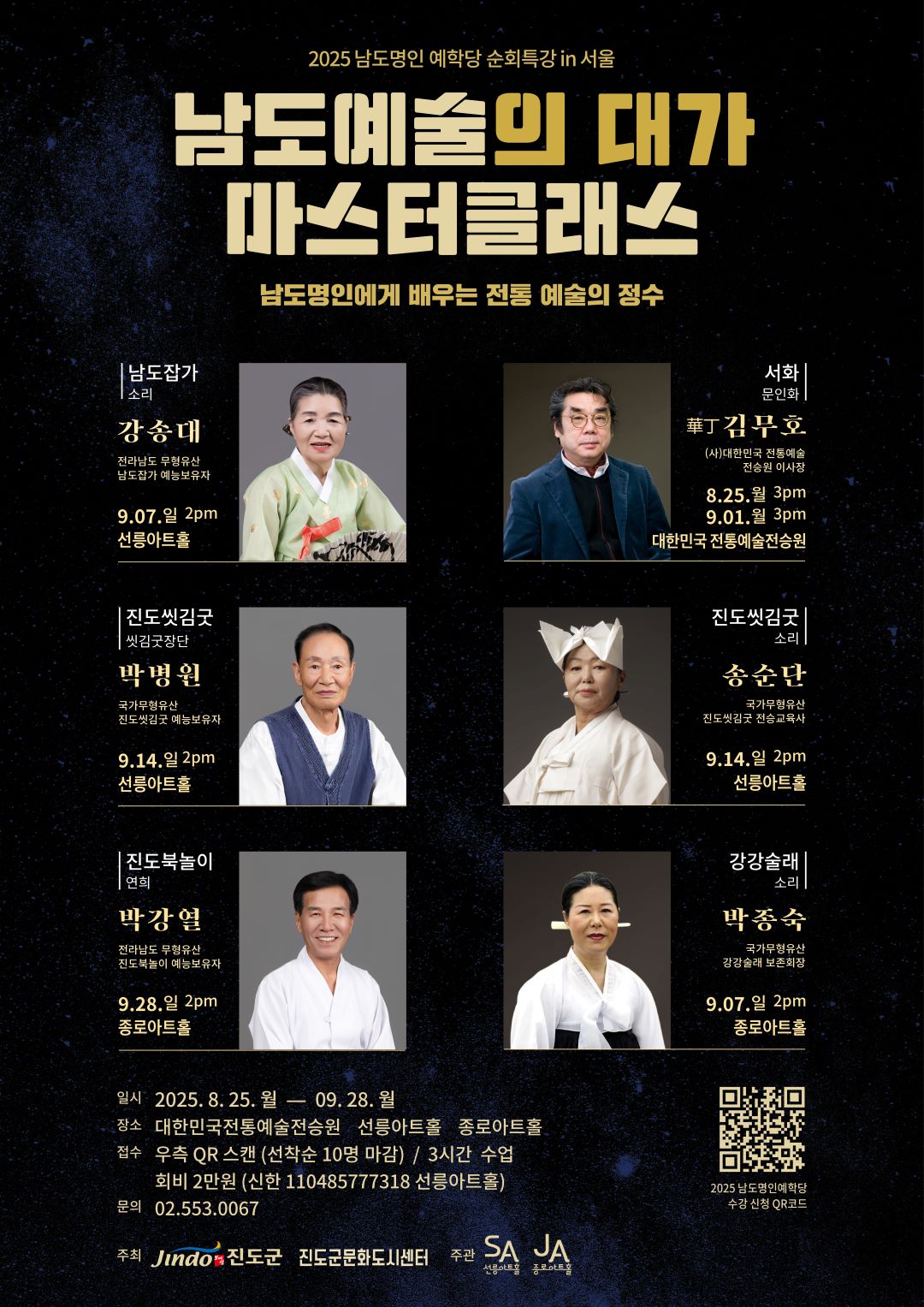 - 2025 남도명인 예학당 순회특강 in서울 남도예술의 대가 마스터클래스 일정 : 8.25 월 3시 / 9.1 월 3시 장소 : 대한민국전통예술전승원 강의실 강사 : 화정 김무호