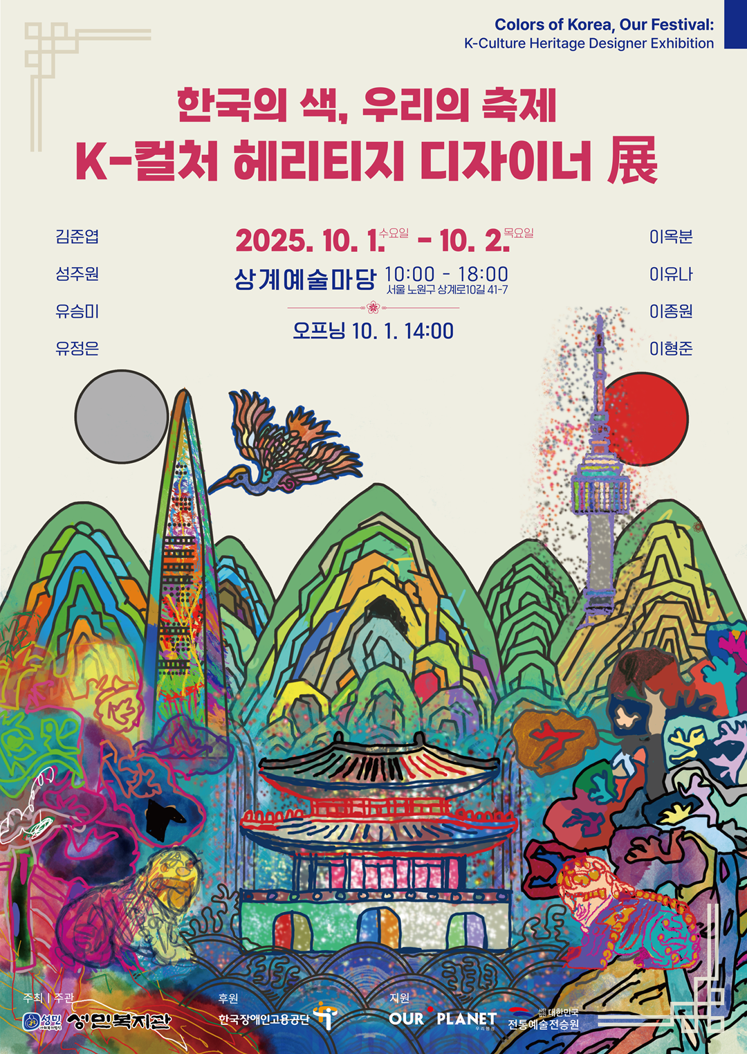 「K-컬처헤리티지 디자이너」전시 안내 서울 성민복지관에서 진행하는 발달장애인 'K-컬처헤리티지 디자이너' 사업은 전승원 평생교육원 강사를 파견하여 수업을 진행하였습니다. 전승원과 협약을 통해 진행되어 발달장애인과 함께 시각 예술의 잠재적 발굴을 위한 프로그램으로 전시를 통해 발달장애인의 가능성을 볼 수 있습니다. 참여 강사 최빈아, 전우경, 윤현희